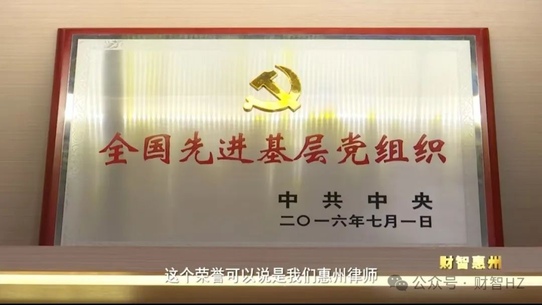 惠州市律师协会会长 周涌: 这个荣誉可以说是我们惠州律师,也是我们惠州市律师协会的镇店之宝,这是中共中央颁发的一个全国先进基层党组织,这样一个荣誉称号,这个在全国的律师协会应该是独此一块。
