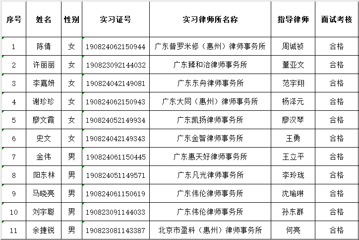 根据《惠州市律师协会申请律师执业人员实习管理及考核实施细则》规定,现将2025年11月实习律师考核结果公示,接受监督。考核结果公示期为七日,公示期间未有异议或异议不成立的,考核结果发生效力.