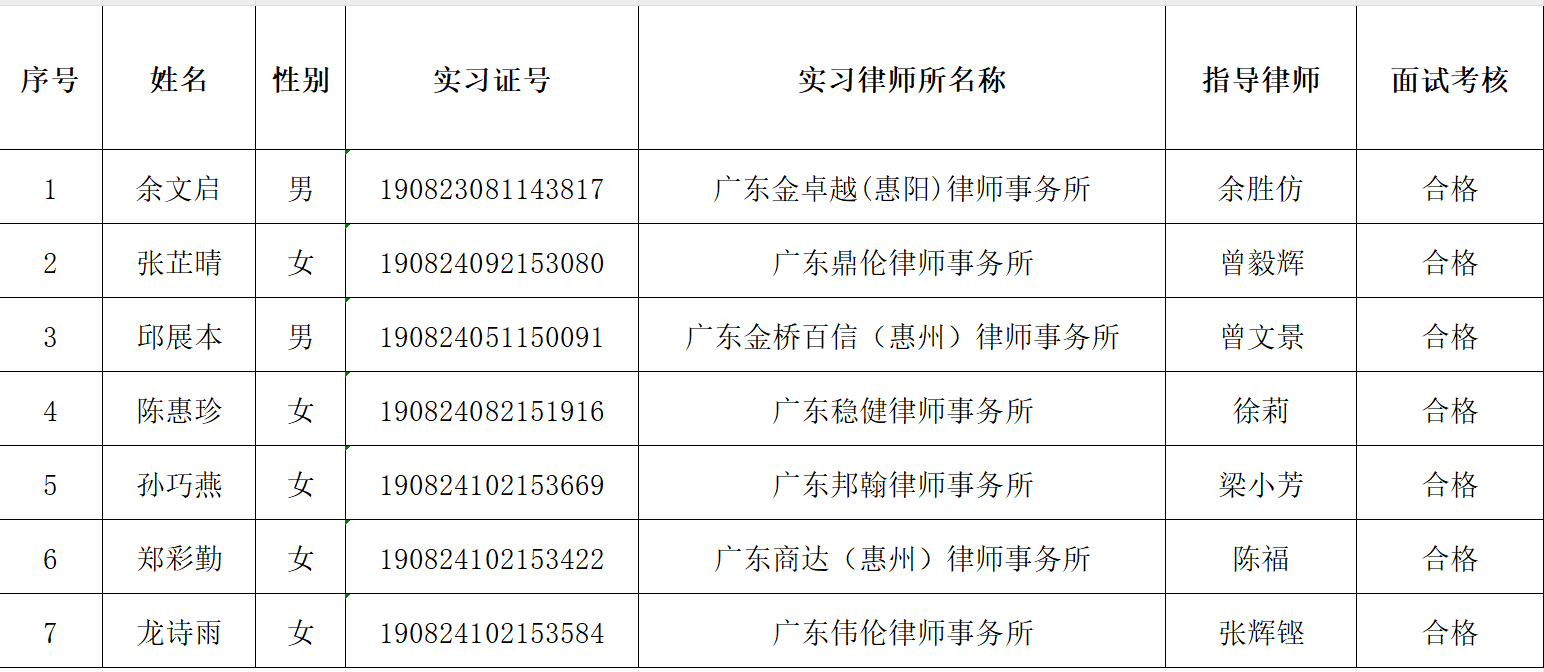 根据《惠州市律师协会申请律师执业人员实习管理及考核实施细则》规定,现将2025年12月实习律师考核结果公示,接受监督。考核结果公示期为七日,公示期间未有异议或异议不成立的,考核结果发生效力.